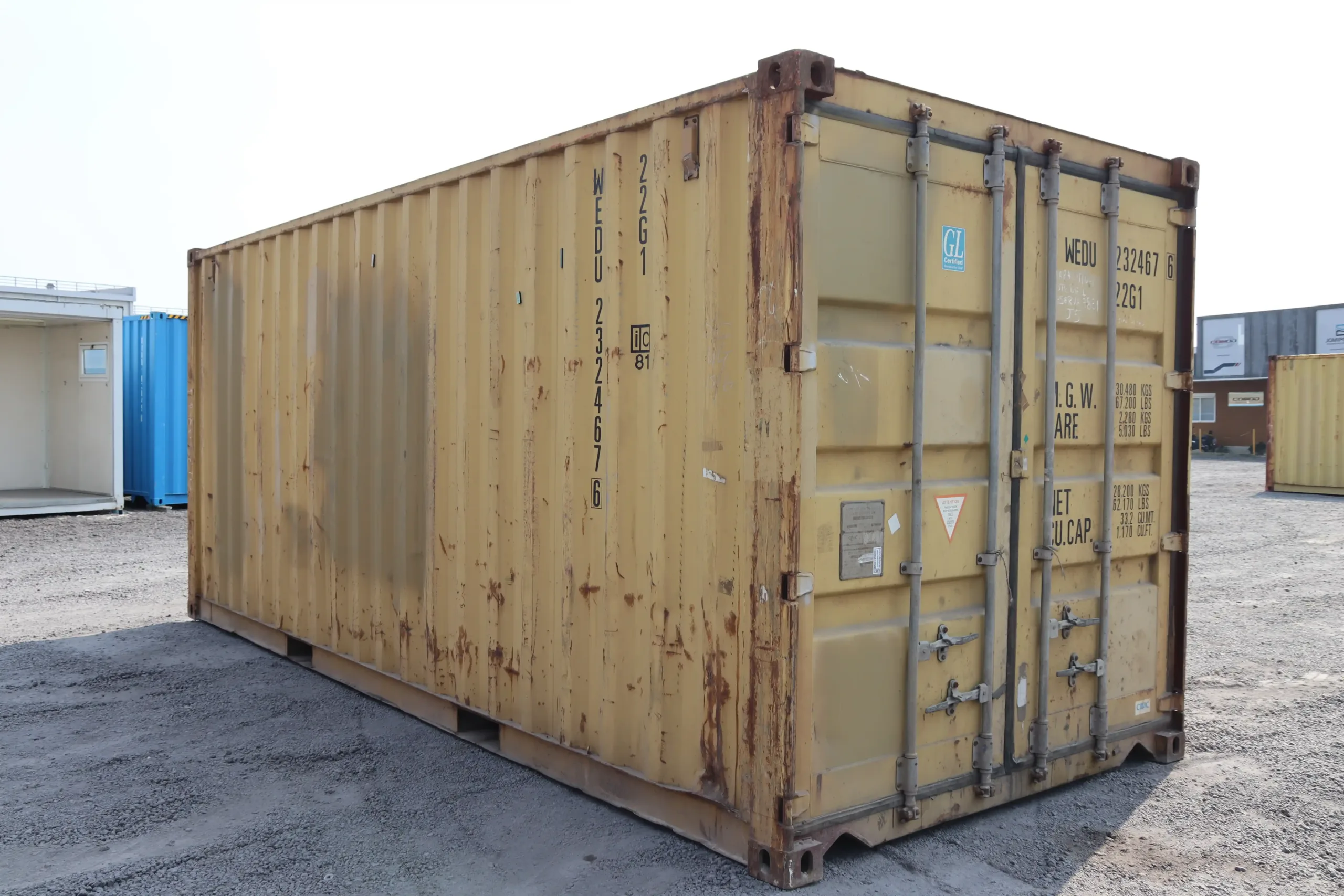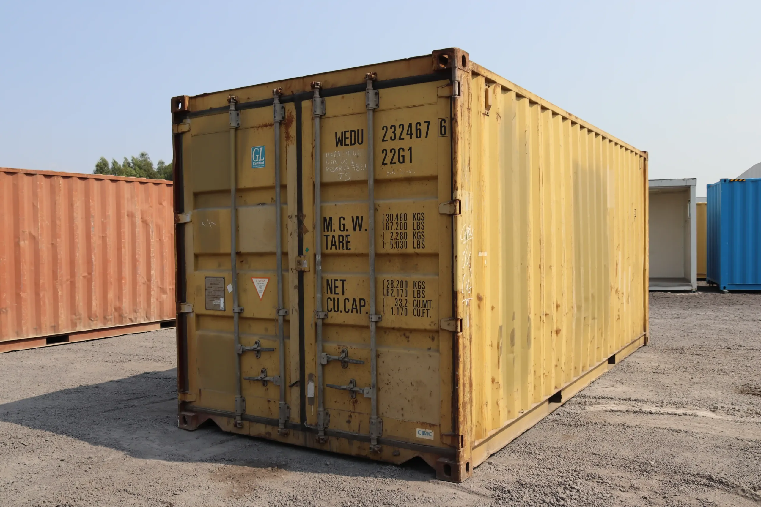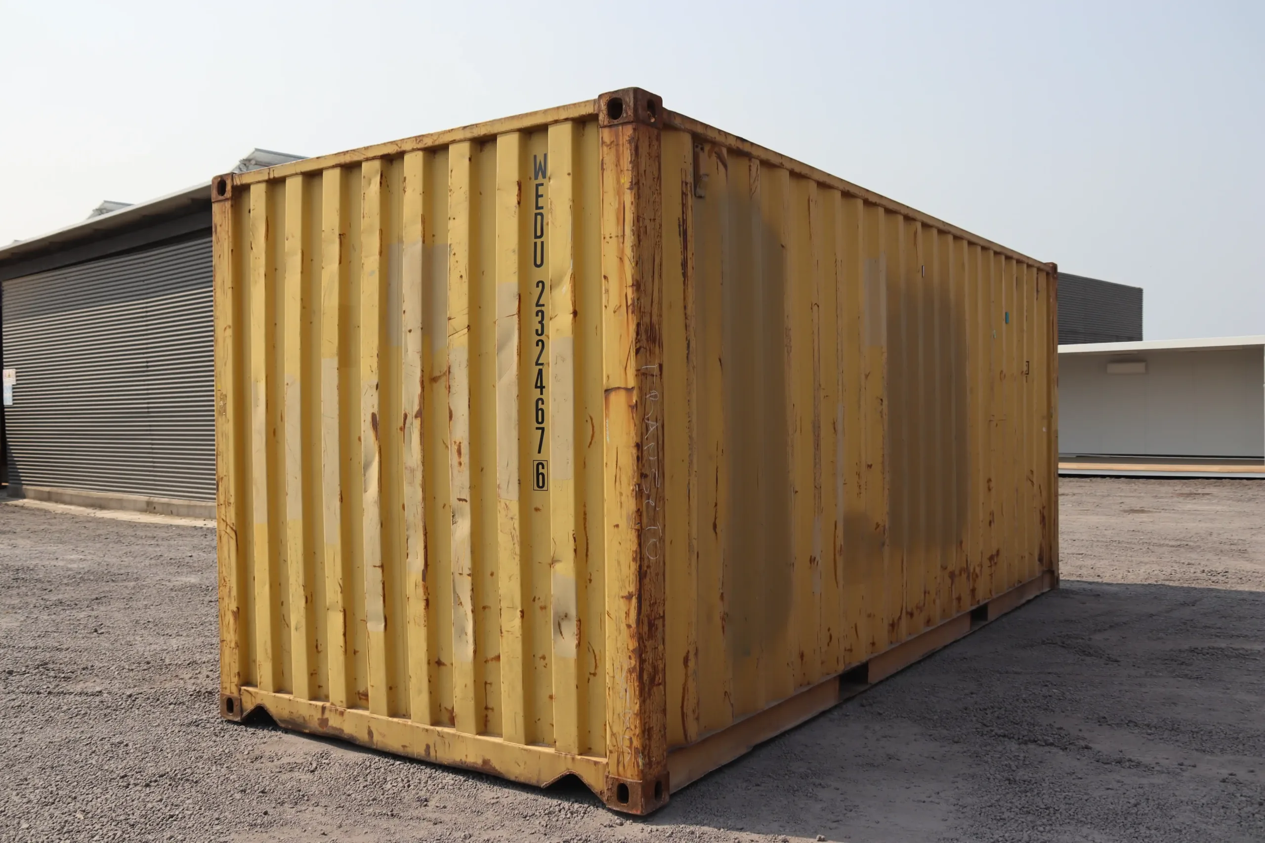 Contenitore giallo usato da 20 piedi, Classe A / Cargo Worthy, idoneo al trasporto marittimo internazionale. Robusto, impermeabile e affidabile, ideale per stoccaggio, esportazione o progetti modulari.