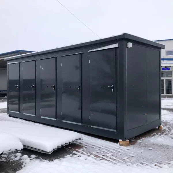 Contenitore sanitario 6,00 x 2,40 m, modulare e conforme CE, ideale per cantieri, eventi e strutture temporanee, con spazi per WC, docce e lavabi, facilmente trasportabile.